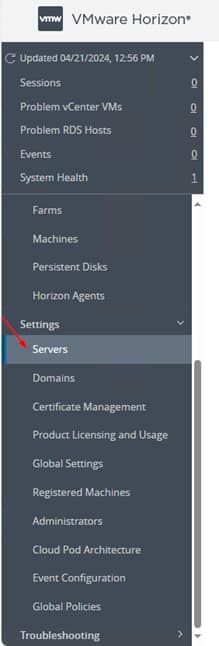 After entering the Horizon license, the next step is to configure vCenter in the settings, go to Servers in the left menu for this purpose.