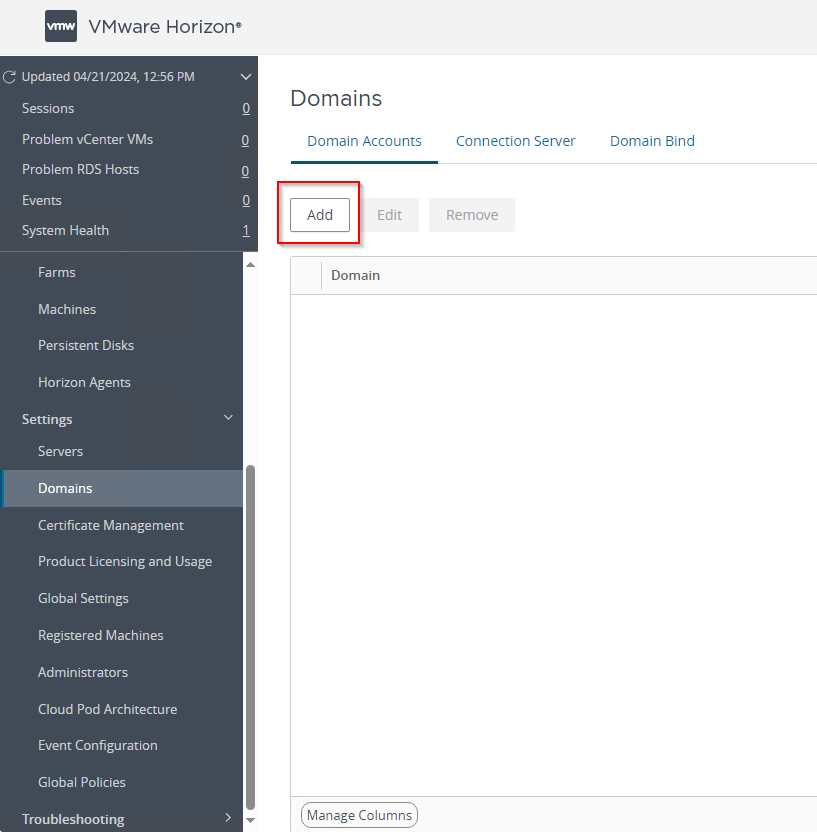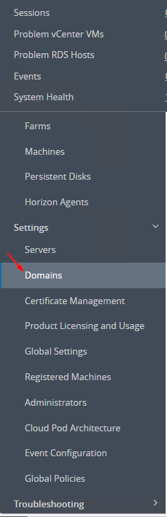 After configuring AD, you need to configure this user in Horizon, to do so go to the option on the left named Domains.