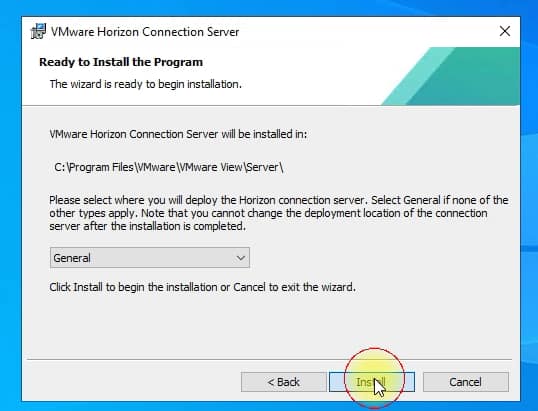 In newer versions VMware allows you to indicate whether it will use Horizon using public clouds, in this case we leave the options General, after selecting Install the installation will begin: