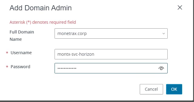 The next step will be to add a domain user who has permission to manage the OU in which we want to create our machines. According to the https://docs.vmware.com/en/VMware-Horizon/2312/horizon-installation/GUID-E91881F4-F8C0-48A5-A1A4-61577E287E29.html documentation, the user must have the following permissions: