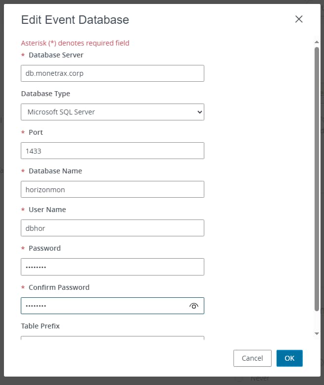 To configure the database from the menu, select Event Configuration and then in the Event Database section select Edit.
