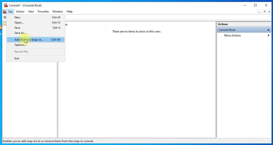In the console window, select File and then Add/Remove Snap-in: