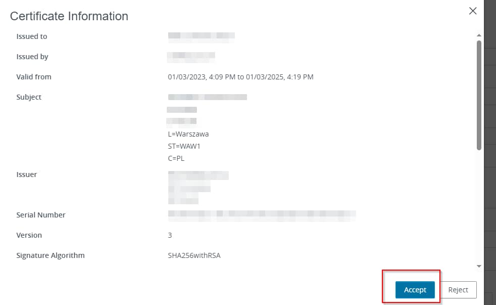 A window with certificate details appears, accept the certificate by selecting Accept