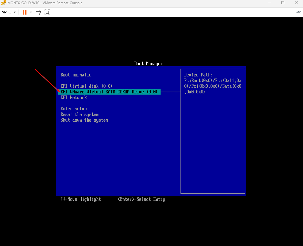Then select the EFI Virtual SATA CDROM Drive option, the Windows installation will be launched