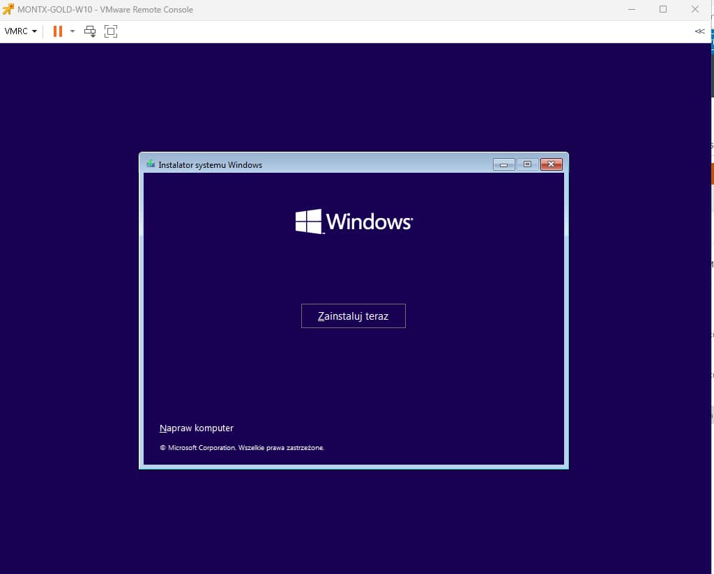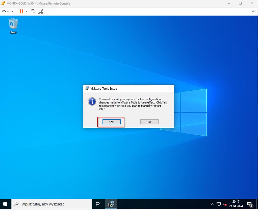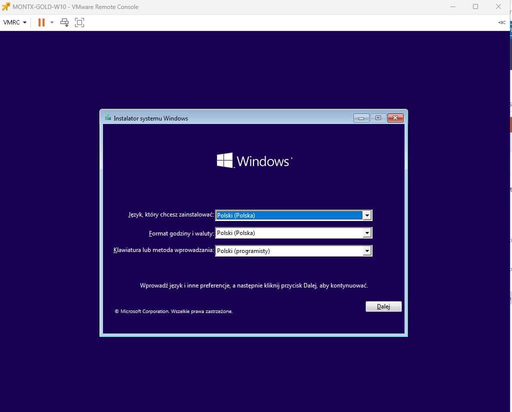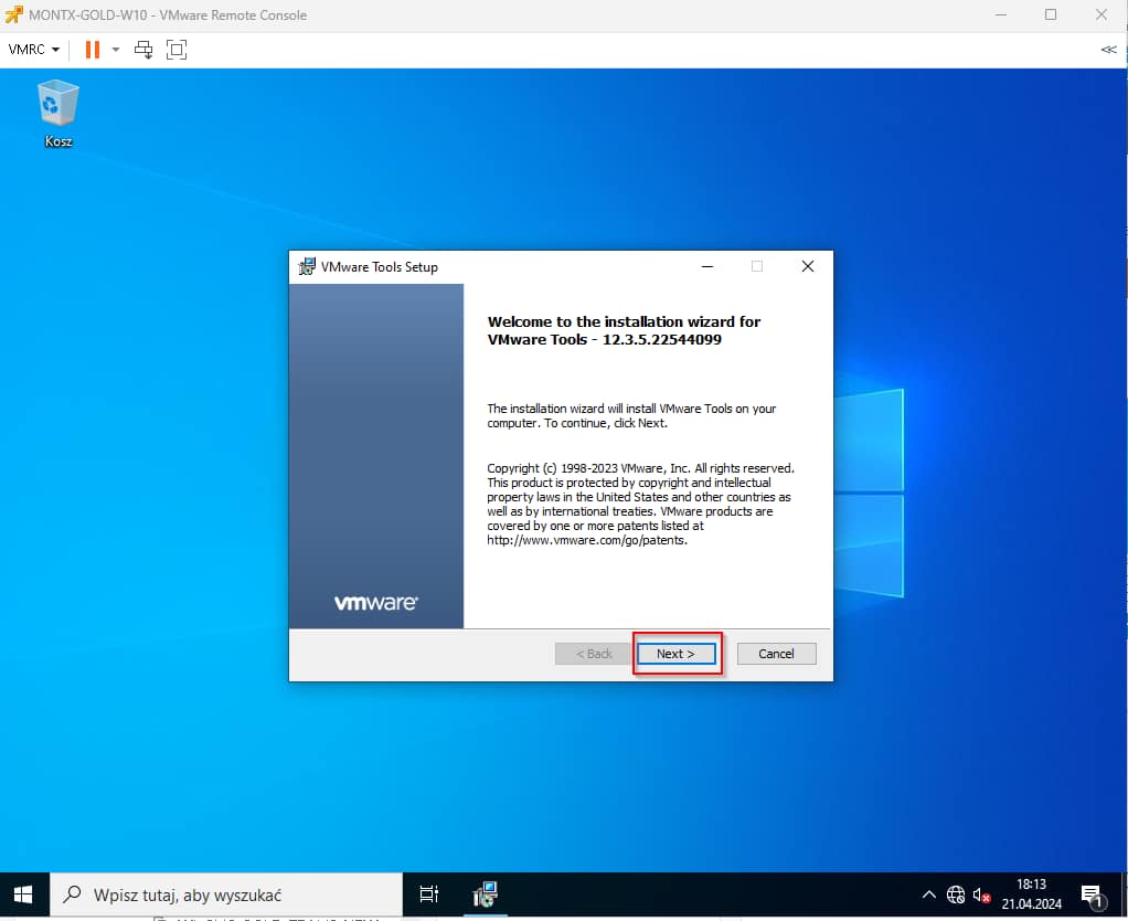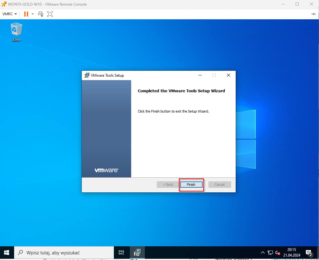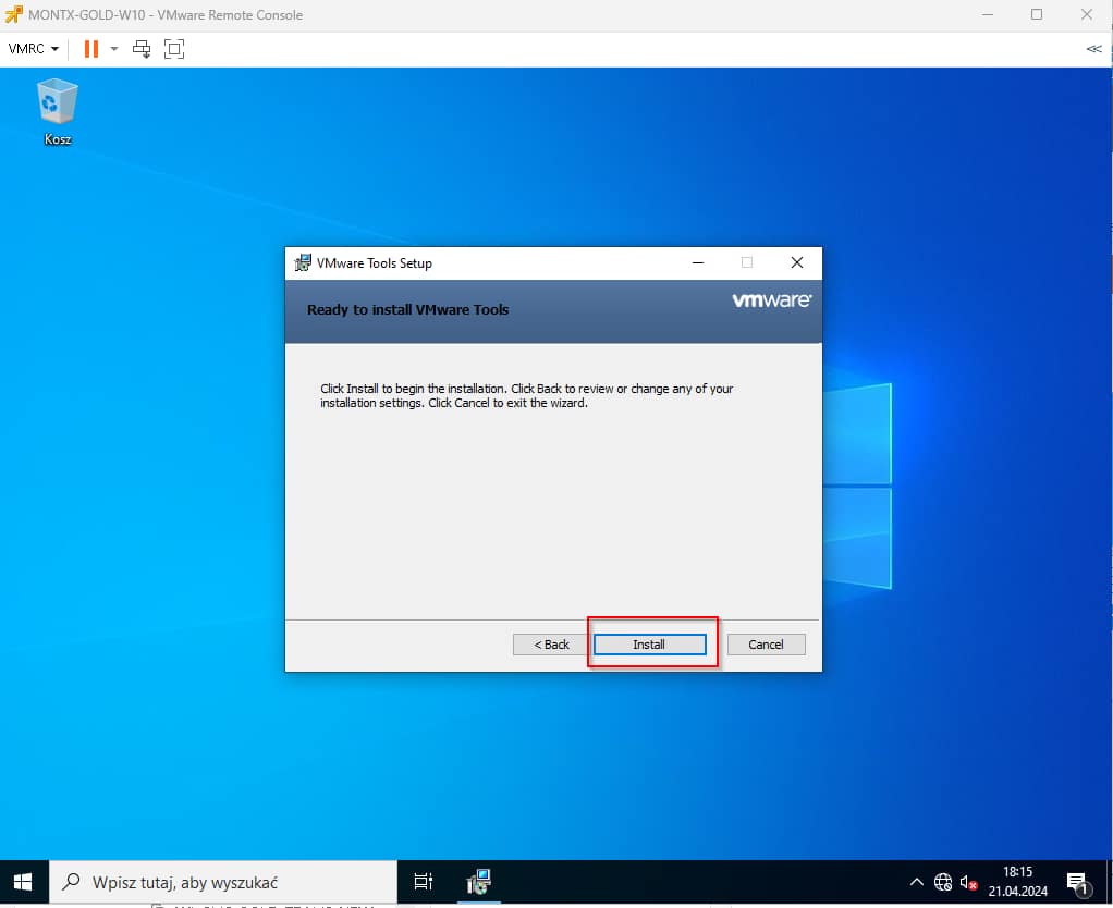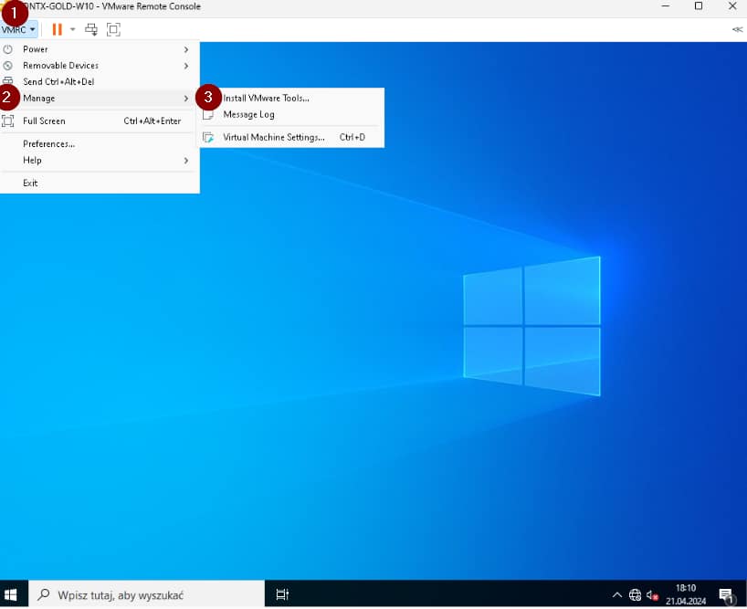The next step is to install VMTools, to do this, go to VMRC -> Manage -> Install Vmware Tools, an ISO will be mounted to the system, run the installer by selecting the D drive and the exe file named setup64.exe