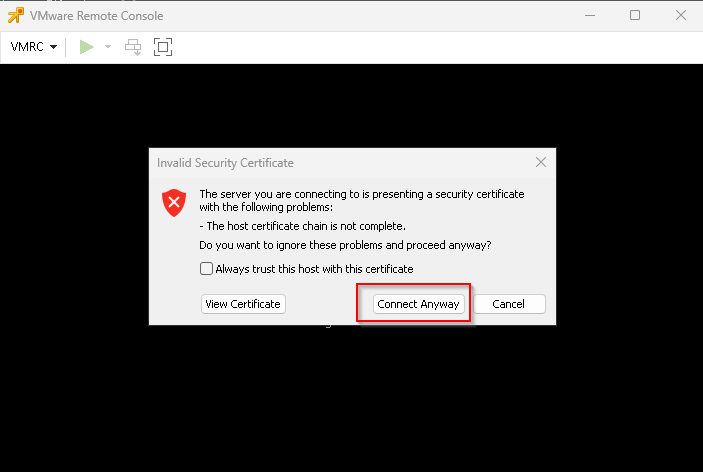 After starting the connection to the machine, you may be prompted with a certificate error, in which case select Connect anyway