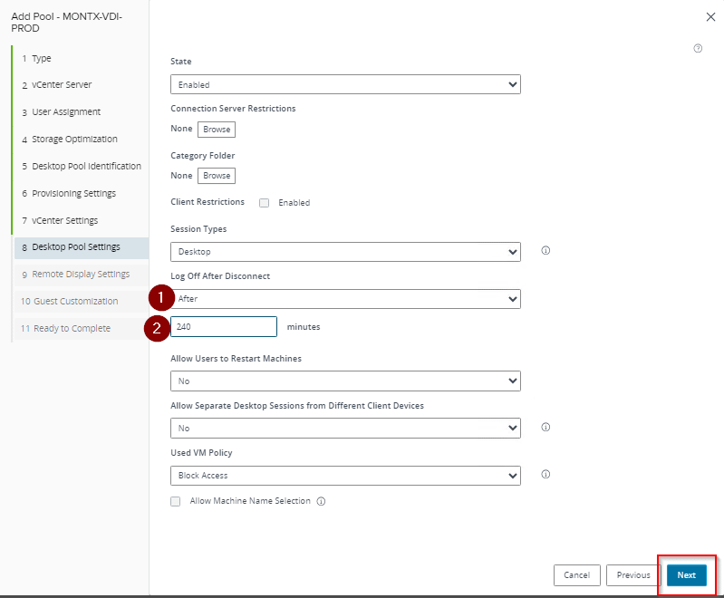 The next step is to configure the VDI pool settings, where you can find the following options: