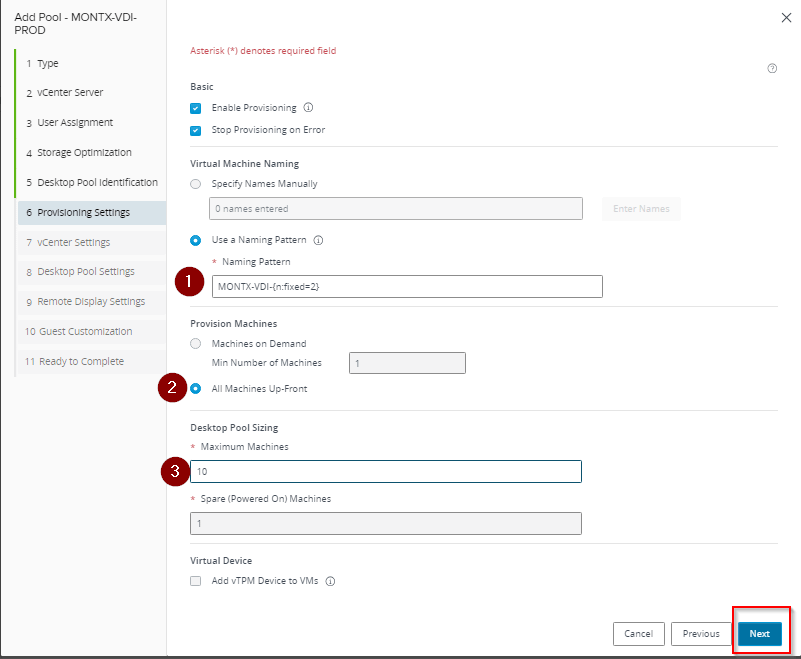 Provisioning Settings is the next stop when configuring a VDI pool in VMware Horizon. The following options are available in this step: