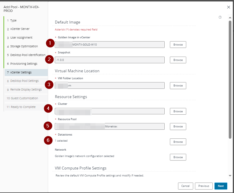 - Golden Image in vCenter – this field is used to specify the path to the VM’s master image file in vCenter. The Browse button allows you to browse and select the appropriate file.