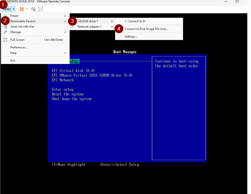 The first step is to connect the ISO to the machine go to VMRC -> Removable Devices -> CD/DVD drive 1 -> Connect to Disk Image File (iso) and then point to the ISO file with Windows 10